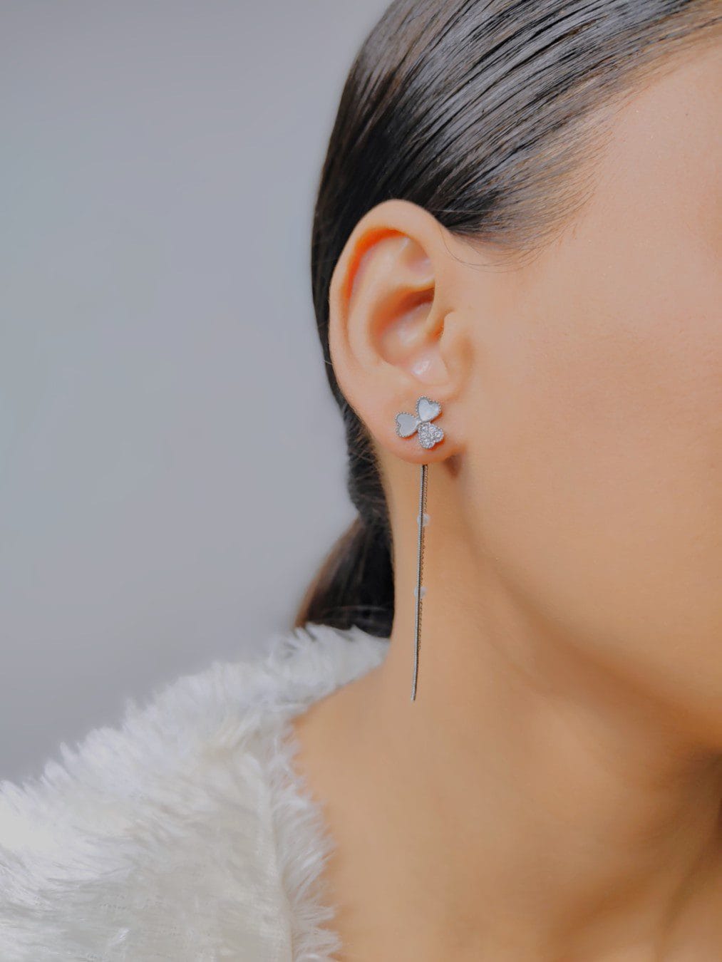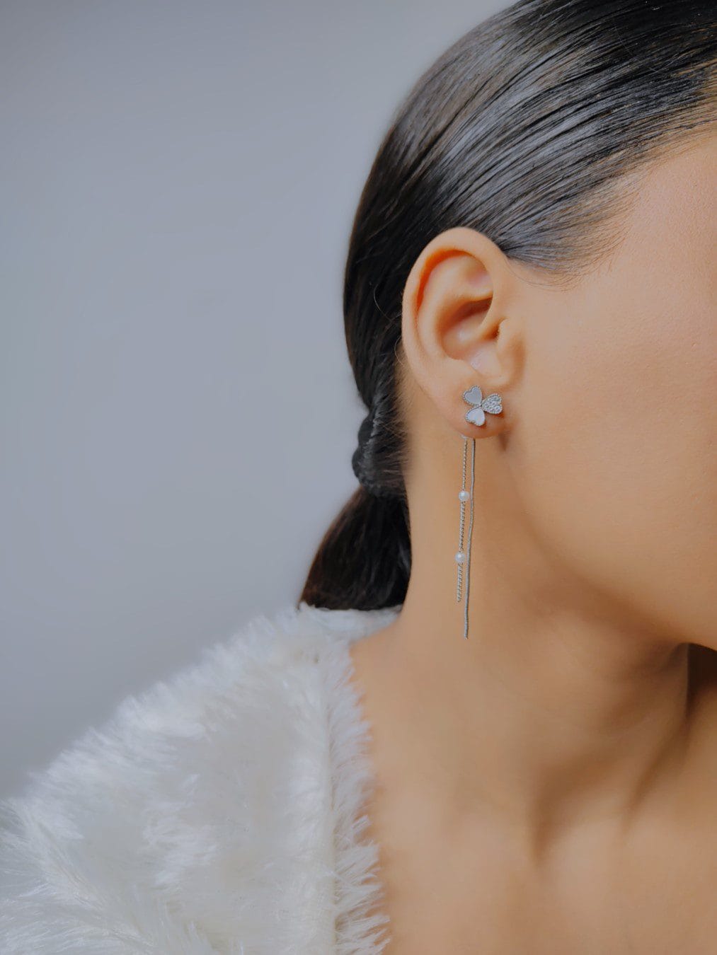Add a touch of delicate elegance to your style with the Ekaashi Clover Chain Drops. These earrings feature a clover-shaped top, adorned with pearl and rhinestone accents, creating a subtle sparkle. The design flows into a long, slender chain embellished with small pearls, adding movement and grace.