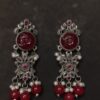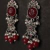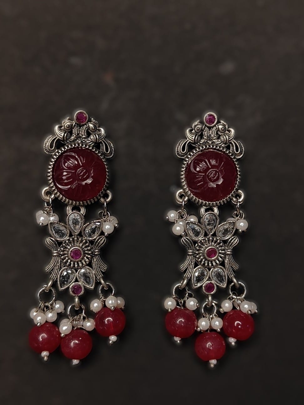 Enhance your jewelry collection with the Ekaashi Crimson Carved Drops. These beautifully crafted earrings feature a unique blend of vintage design and rich, textured detail. The oxidized silver finish provides an antique look, while the deeply carved red stones add a touch of regal elegance.