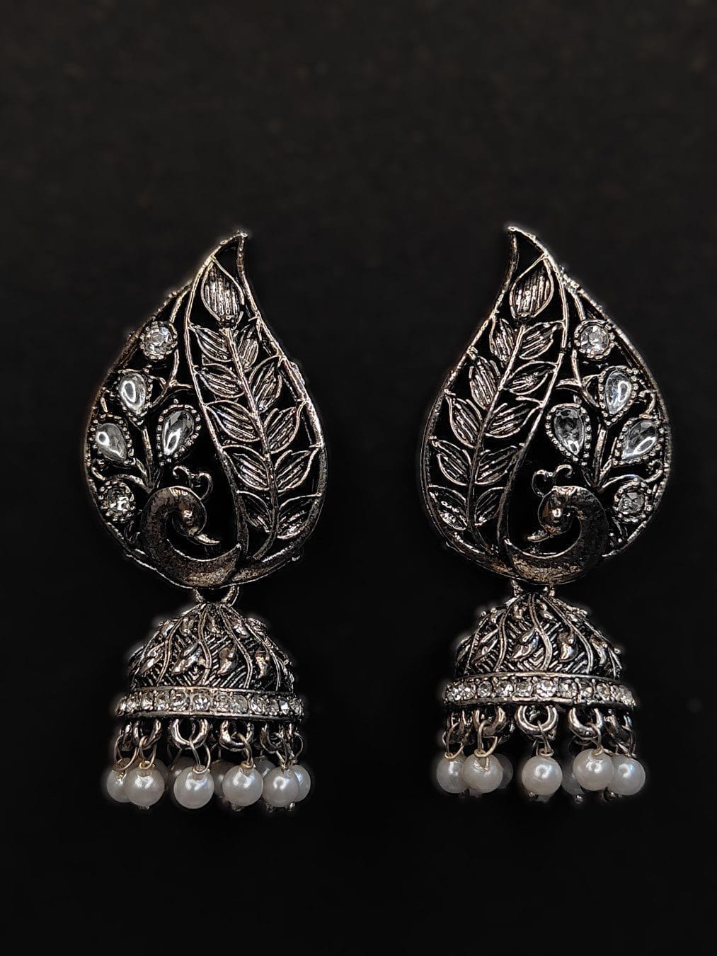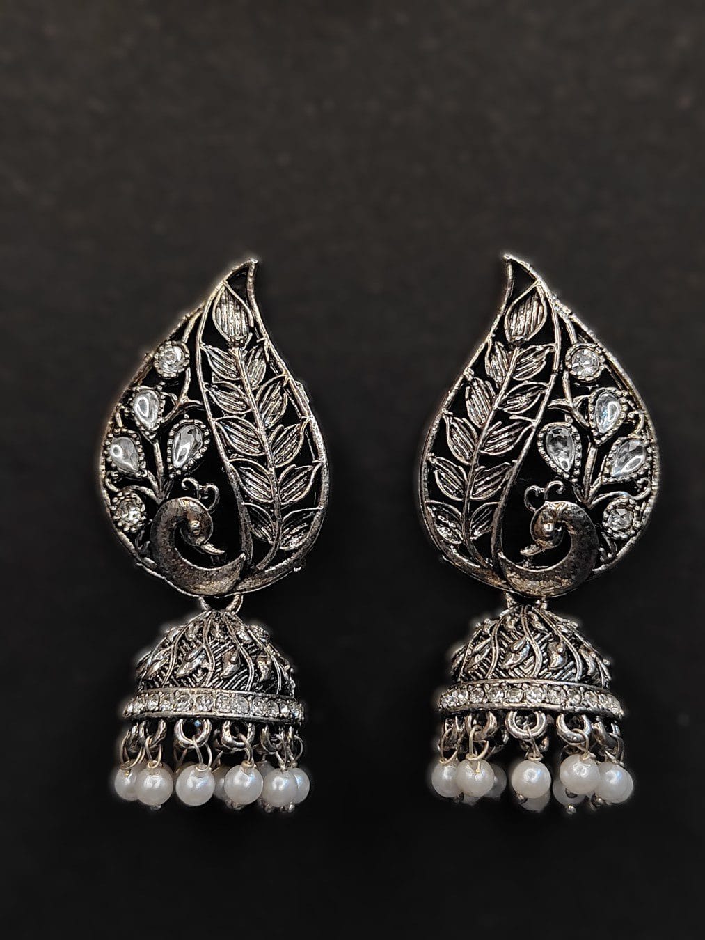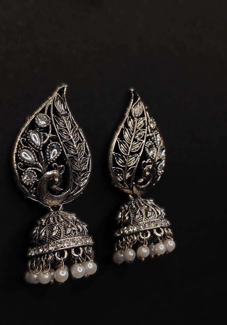 The earrings feature a beautifully detailed peacock motif, with intricate feather-like patterns and sparkling stones highlighting the bird’s form. The design flows into a traditional jhumka bell, adorned with sparkling stones and delicate pearl drops, enhancing the overall elegance and movement of the earrings.