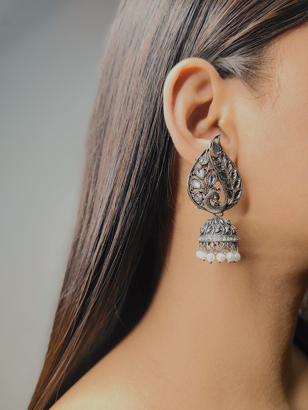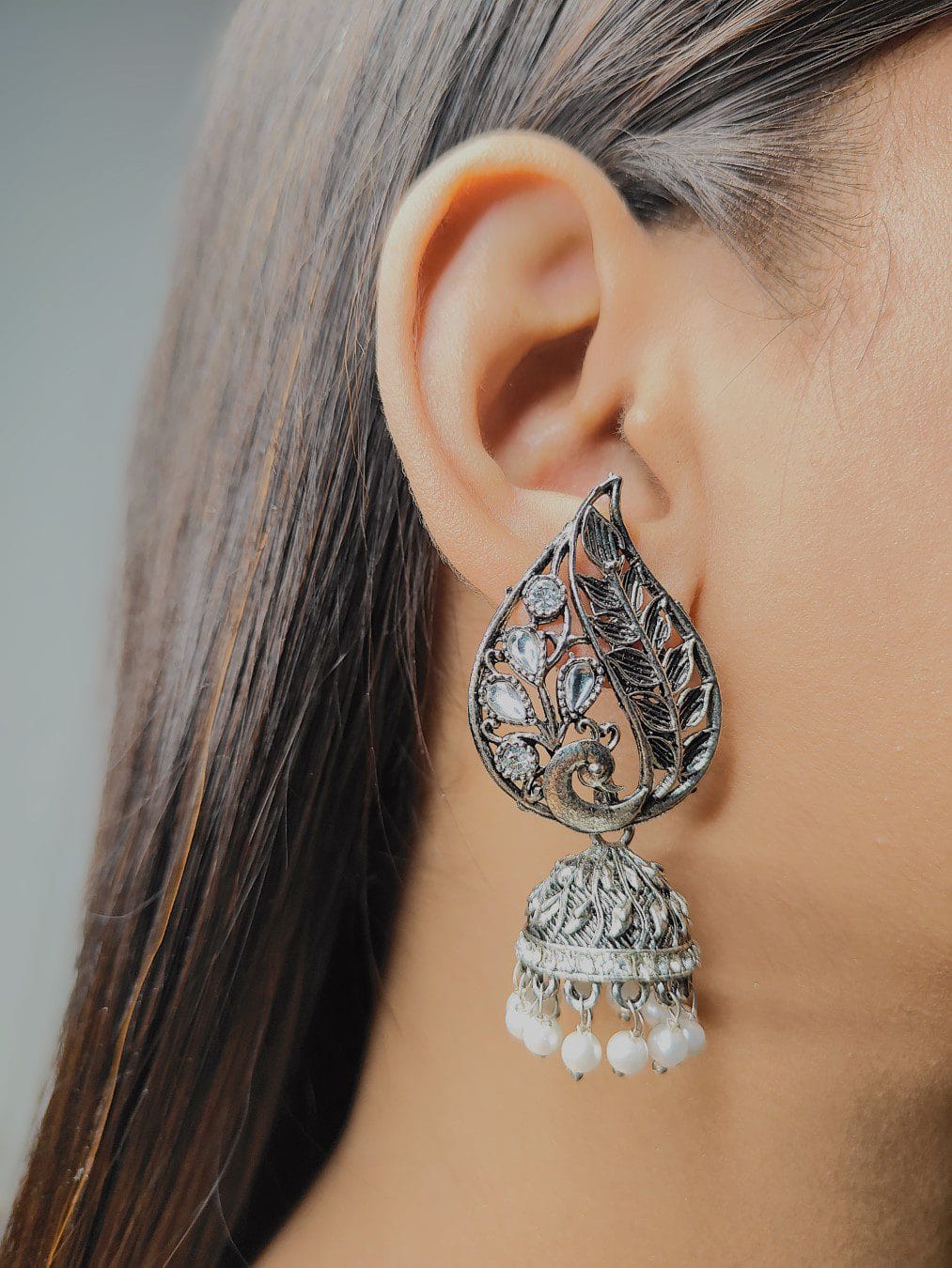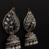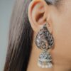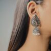 Adorn yourself with the captivating beauty of the Ekaashi Feathered Peacock Jhumkas. These exquisitely crafted earrings showcase a unique peacock and feather design with a touch of traditional elegance. The oxidized silver finish provides an antique charm, while the sparkling stones and pearl accents add a touch of regal allure.