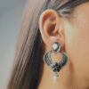 The earrings showcase a heart-shaped body, intricately designed with floral and geometric patterns, creating a captivating romantic aesthetic. The top of the earring features a teardrop-shaped stone, while the bottom is adorned with a delicate pearl drop.