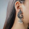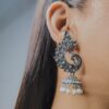 Adorn yourself with the majestic beauty of the Ekaashi Majestic Peacock Jhumkas. These exquisitely crafted earrings showcase a unique peacock design with a touch of traditional elegance. The oxidized silver finish provides an antique charm, while the sparkling stones and pearl accents add a touch of regal allure.